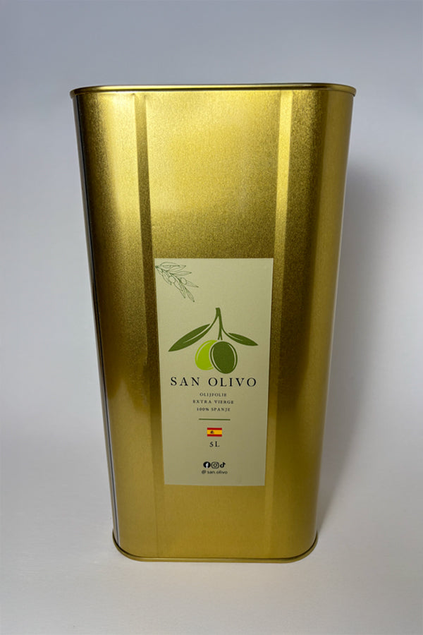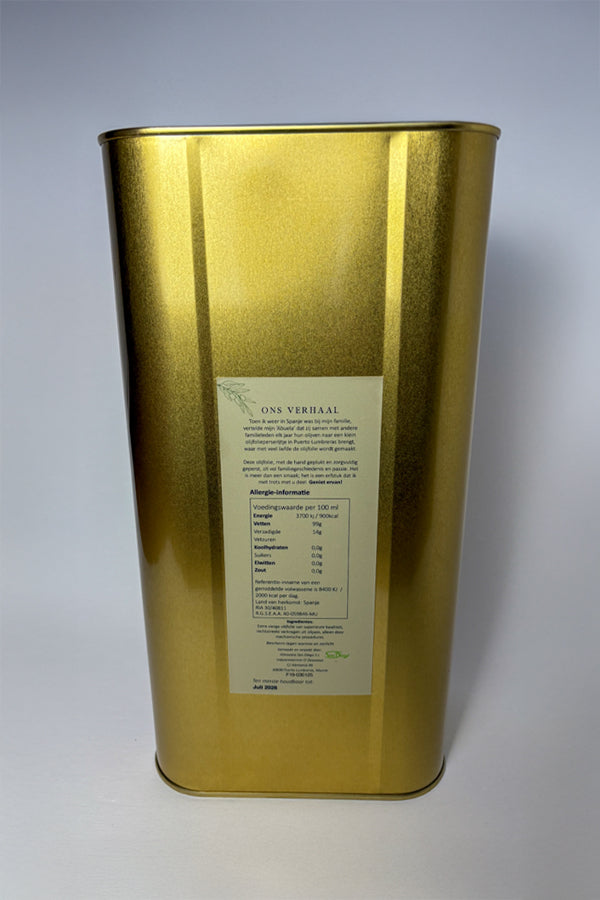 Voor de echte grootverbruikers: 5 liter in blik. Gemaakt voor iedereen die wil genieten van de pure, volle smaak van onze Spaanse Extra Vierge Olijfolie. Koudgeperst en van de hoogste kwaliteit olijven, verpakt in een praktisch blik voor optimaal behoud van smaak. Perfect voor dagelijks gebruik of om te delen met familie en vrienden.